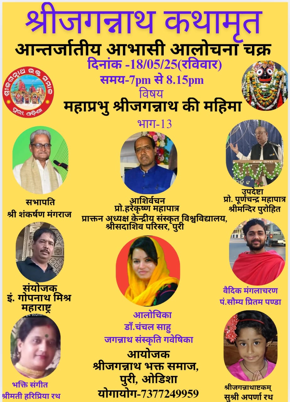 ଶ୍ରୀଜଗନ୍ନାଥ ଭକ୍ତ ସମାଜ, ପୁରୀ ତରଫରୁ “ଶ୍ରୀଜଗନ୍ନାଥ ମହିମା ” ଶୀର୍ଷକ ଆଲୋଚନା ଚକ୍ରରେ ଅନୁଷ୍ଠାନର ସଭାପତି ଶ୍ରୀ ଶଙ୍କର୍ଷଣ ମଙ୍ଗରାଜ ପୌରହିତ୍ୟ କରିଥିଲେ। ଅନୁଷ୍ଠାନର ଉପଦେଷ୍ଟା ପ୍ରଫେସର ପୂର୍ଣ୍ଣ ଚନ୍ଦ୍ର ମହାପାତ୍ର ସଭାର ଆଭିମୁଖ୍ୟ ପ୍ରଦାନ କରିଥିଲେ । ସର୍ବ ପ୍ରଥମେ କେନ୍ଦ୍ରୀୟ ସଂସ୍କୃତ ବିଶ୍ୱବିଦ୍ୟାଳୟ ସଦାଶିବ ପରିସର ପୁରୀର ପୂର୍ବତନ ଅଧ୍ୟକ୍ଷ ପ୍ରଫେସର ଶହରେକୃଷ୍ଣ ମହାପାତ୍ର ଯୋଗ ଦେଇ ଆଶିର୍ବାଚନ ପ୍ରଦାନ କରିଥିଲେ। ମୁଖ୍ୟ ବକ୍ତା ଭାବେ ଡା. ଚଂଚଲ ସାହୁ ଯୋଗ ଦେଇ ଶ୍ରୀ ଜଗନ୍ନାଥ ମହିମା ଶାସ୍ତ୍ର ଓ ଲୋକ କଥାରେ କିପରି ବର୍ଣ୍ଣନା କରାଯାଇଛି, ଶ୍ରୀଜଗନ୍ନାଥ ଶବ୍ଦର ସୃଷ୍ଟି, ମନ୍ଦିରରେ ଉପାସନା ତଥା ଶ୍ରୀଜୀଉ ମାନଙ୍କର ତତ୍ତ୍ଵକୁ ବିଷଦ ଆଲୋଚନା କରିଥିଲେ। ଆହୁରି ମଧ୍ୟ ମହାପ୍ରଭୁ ଭକ୍ତ ସହ ନୀଳାଚଳରେ କିପରି ଲୀଳା କରୁଅଛନ୍ତି ଓ ଲୀଳା ମାଧ୍ୟମରେ ତାଙ୍କର ମହିମା କିପରି ବିସ୍ତାର ଲାଭ କରିଛି ସେ ସମନ୍ଧରେ ମତ ବ୍ୟକ୍ତ କରିଥିଲେ। ଏହି କାର୍ଯ୍ୟକ୍ରମରେ ପ୍ରଫେସର ଗୌରପ୍ରିୟା ଦାଶ, ବିଶିଷ୍ଟ ସମାଜସେବୀ ଡଃ ନାରାୟଣ ମହାପାତ୍ର, ପ୍ରଫେସର ସାବିତ୍ରୀ ଶତପଥୀ, ଡଃ ବଳରାମ ଦାଶ, ଇଂ ବିଜୟ କୁମାର ପଣ୍ଡା, ଶ୍ରୀ ଅତୁଲ୍ ଶର୍ମା, ଶ୍ରୀଶମ୍ଭୁ ସିଂ, ଇଂ ସୁଭେନ୍ଦୁ ସାମଲ, ସୁଶ୍ରୀ ପୁଷ୍ପିତା ପଟ୍ଟନାୟକ,ତଃ ଅଜିୟାନନ୍ଦ ସାହୁ, କାର୍ତ୍ତିକ ସାହୁ, କୃଷ୍ଣ ପ୍ରିୟା ସାହୁ, ବୁଦ୍ଧଦେବ ଚକ୍ରବର୍ତ୍ତୀ ପ୍ରମୁଖ ଆଲୋଚନାରେ ଅଂଶଗ୍ରହଣ କରିଥିଲେ। ଦେଶର ବିଭିନ୍ନ ରାଜ୍ୟରୁ ଜଗନ୍ନାଥ ଭକ୍ତ ମାନେ ଏହି କାର୍ଯ୍ୟକ୍ରମରେ ଯୋଗଦାନ କରିଥିଲେ।ପୁରୀରୁ ପଣ୍ଡିତ ସୌମ୍ୟ ପ୍ରିତମ ଦାଶ ବୈଦିକ ମଙ୍ଗଳାଚରଣ କରିଥିଲେ l ଶ୍ରୀ ବିଜୟ କୁମାର ସାହୁ ଜୟ ଧନୀ ଦେଇଥିଲେ । ମହାରାଷ୍ଟ୍ରରୁ ଇଂ ଗୋପନାଥ ମିଶ୍ର ସଭା ପରିଚାଳନା କରିଥିଲେ l ପୁରୀରୁ କଣ୍ଠଶିଳ୍ପୀ ଶ୍ରୀମତୀ ହରପ୍ରିୟା ରଥ ଭକ୍ତି ସଂଗୀତ ପରିବେଷଣ କରିଥିଲେ, ସୁଶ୍ରୀ ଅପର୍ଣ୍ଣା ରଥ ଜଗନ୍ନାଥଷ୍ଟକ ଗାନ କରିଥିଲେ। ସଂପାଦକ ଡ. ଶଶିକାନ୍ତ ରଥ ଧନ୍ୟବାଦ ଅର୍ପଣ କରିଥିଲେ।