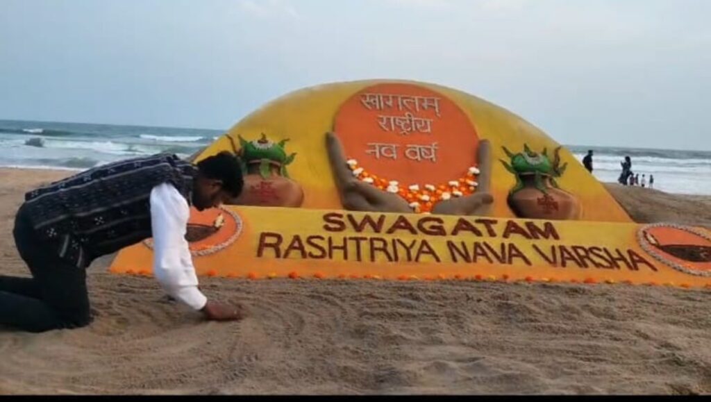 ବାଲୁକାକଳାରେ ରାଷ୍ଟ୍ରୀୟ ହିନ୍ଦୁ ନବବର୍ଷକୁ ଶୁଭେଚ୍ଛା ଜ୍ଞାପନ l ପୁରୀ ବେଳାଭୂମିରେ ଆନ୍ତର୍ଜାତିକ ବାଲୁକା ଚିତ୍ରଶିଳ୍ପୀ ପଦ୍ମଶ୍ରୀ ସୁଦର୍ଶନ ପଟ୍ଟନାୟକ ରାଷ୍ଟ୍ରୀୟ ନବବର୍ଷ ଉପଲକ୍ଷେ ସ୍ୱାଗତ ଜଣାଇବା ସହ ଏକ ସୁନ୍ଦର ବାଲୁକାକୃତି ନିର୍ମାଣ କରିଛନ୍ତି l ବାଲୁକା ଚିତ୍ରକଳାରେ କଳସ ଓ ଦୀପରେ ବାଲୁକା କଳାକୃତି ପ୍ରସ୍ତୁତ କରିଛନ୍ତି ଶ୍ରୀ ପଟ୍ଟନାୟକ l ବାଲୁକା ଚିତ୍ରକଳାରେ ସ୍ୱାଗତଂ ରାଷ୍ଟ୍ରୀୟ ନବବର୍ଷ ଲେଖିବା ସହ ବିଭିନ୍ନ ରଙ୍ଗ ବେରଙ୍ଗର ଗେଣ୍ଡୁ ଫୁଲରେ ଅତି ଆକର୍ଷଣୀୟ ଭାବେ ସୁସଜ୍ଜିତ କରାଯାଇଛି l ପ୍ରତିବର୍ଷ ଚୈତ୍ରଶୁକ୍ଳ ପ୍ରତିପଦାରେ ହିନ୍ଦୁ ନବବର୍ଷ ତଥା ରାଷ୍ଟ୍ରୀୟ ନବବର୍ଷକୁ ପାଳନ କରାଯାଇଥାଏ l ଆଜି ରାଷ୍ଟ୍ରୀୟ ନବବର୍ଷ ପଡୁଥିବାରୁ ସୁଦର୍ଶନ ପଟ୍ଟନାୟକ ପୁରୀ ବେଳାଭୂମିରେ ବାଲୁକାକଳାରେ ଶୁଭେଚ୍ଛା ଓ ଶୁଭକାମନା ଜଣାଇଛନ୍ତି ।