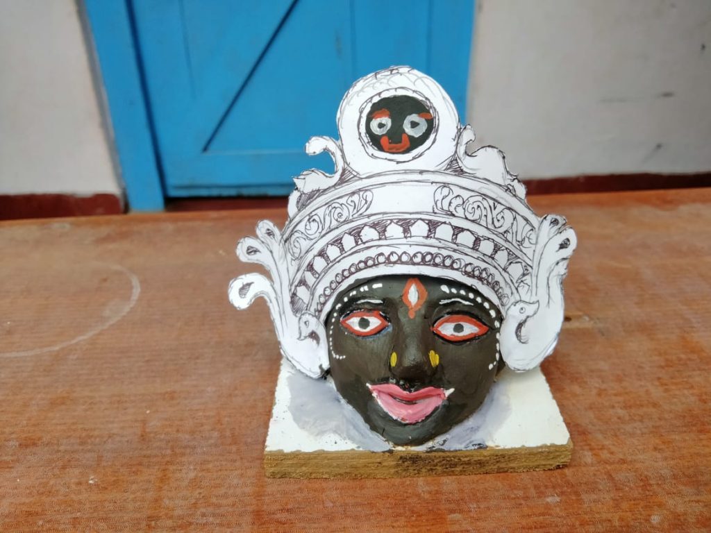 ପୁରୀ ଏହି ମୂର୍ତ୍ତି ମୁଁ ଶାରଦୀୟ ଦୁର୍ଗା ପୂଜା ଉପଲକ୍ଷେ କରିଅଛି। ଏହି ମୂର୍ତ୍ତି କୁ ଗଢିବା ପାଇଁ ମୋତେ ୪୮ ଘଣ୍ଟା ସମୟ ଲାଗିଛି। ଏହି ମୂର୍ତ୍ତିରେ ମୁଁ ମଇଦା, ଚାହା ପତି, ଚକଲେଟ୍ ଏବଂ ପ୍ରାକୃତିକ ରଙ୍ଗ ବ୍ୟବହାର କରିଅଛି। ଏହି ମୂର୍ତ୍ତିର ଉଚ୍ଚତା ପ୍ରାୟ ୫ ଇଞ୍ଚ ଏବଂ ଏହି ମୂର୍ତ୍ତିର ଓଜନ ପ୍ରାୟ ୧୫୦ ଗ୍ରାମ। ୪ ଦିନ ବ୍ଯାପି ମା ଦୁର୍ଗାଙ୍କର ଆରାଧନା କରାଯାଏ, ଲକ୍ଷ ଲକ୍ଷ ଭକ୍ତ ଏକାଠି ହୁଅନ୍ତି ମା’ ଙ୍କର ଆଶୀର୍ବାଦ ପାଇବାକୁ। କିନ୍ତୁ ଏହି ବର୍ଷ ମହାମାରୀ କୋରୋନା ଯୋଗୁଁ ମା’ ଙ୍କର ଦର୍ଶନ ବନ୍ଦ। ମୁଁ ଏହି ମୂର୍ତ୍ତି ଜରିଆରେ ସମସ୍ତଙ୍କୁ ଏହି ବାର୍ତ୍ତା ଦେବାକୁ ଚାହୁଁଛି ଯେ ଆମେ ସମସ୍ତେ ଘରେ ବସି ମହିଷାସୁରମର୍ଦ୍ଦିନୀ ମା’ ଦୁର୍ଗାଙ୍କ ନିକଟରେ ଏହି ପ୍ରାର୍ଥନା କରିବା ଯେ ଏହି କୋରୋନା ନାମକ ମହାମାରୀକୁ ନାଶ କରନ୍ତୁ ଏବଂ ସମସ୍ତଙ୍କ ଜୀବନରେ ସୁଖ ଶାନ୍ତି ପୂର୍ବ ଭଳି ପ୍ରଦାନ କରି ଦିଅନ୍ତୁ।