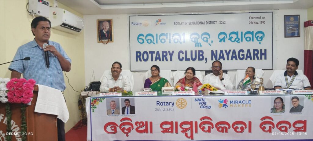 ନୟାଗଡ,ତା 04.08.2025. 1866 ମସିହା ଅଗଷ୍ଟ 4 ତାରିଖରେ ପ୍ରଥମେ ପ୍ରକାଶ ପାଇଥିଲା ଓଡିଶାର ପ୍ରଥମ ଖବରକାଗଜ *ଉତ୍କଳ ଦୀପିକା* କର୍ମବୀର ଗୌରୀ ଶଙ୍କର ରାୟ ଓ ବାବୁ ବିଚିତ୍ରାନନ୍ଦ ଦାସ ଙ୍କର ଅଦମ୍ୟ ପ୍ରଚେଷ୍ଟାରେ l ଯାହାକି ପରବର୍ତ୍ତୀ ସମୟରେ ସ୍ୱତନ୍ତ୍ର ଓଡିଶା ପ୍ରଦେଶ ଗଠନରେ ସହାୟକ ହୋଇଥିଲା l ସେହି ଦିବସ ଟିକୁ ଓଡ଼ିଆ ସାମ୍ବାଦିକତା ଦିବସ ଭାବରେ ସାରା ଓଡ଼ିଶାରେ ସାଡ଼ମ୍ବରେ ପାଳନ କରାଯାଉଛି l ନୟାଗଡ ରୋଟାରୀ କ୍ଲବ ଦ୍ୱାରା ଆୟୋଜିତ ଏହି ମହାନ ଦିବସରେ ନୟାଗଡ଼ ଜିଲ୍ଲାର ଅର୍ଦ୍ଧ ଶତକକରୁ ଅଧିକ ସାମ୍ବାଦିକଙ୍କୁ ସମ୍ବର୍ଦ୍ଧନା ଜ୍ଞାପନ କରାଯାଇଛି l କ୍ଲବ ସଭାପତି ବସିରନ ବିବି ଙ୍କ ଅଧ୍ୟକ୍ଷତା ରେ ଆୟୋଜିତ ଏହି ସଭାରେ ମୁଖ୍ୟ ଅତିଥି ନୟାଗଡ ଜିଲ୍ଲା ପରିଷଦ ସଭାପତି ଇଂ ଦେବାଶିଷ ପଟ୍ଟନାୟକ,ମୁଖ୍ୟ ବକ୍ତା ନୟାଗଡ ପୌର ପରିଷଦ ଅଧକ୍ଷ୍ୟା ଶ୍ରୀମତୀ ନିରୁପମା ଖଟେଇ,ସମ୍ମାନିତ ଅତିଥିଭାବେ ଜିଲ୍ଲା ସୂଚନା ଓ ଲୋକ ସମ୍ପର୍କ ଅଧିକାରିଣୀ ଶ୍ରୀମତୀ ଜ୍ୟୋତ୍ସମୟୀ ଆଚାର୍ଯ୍ୟ ଯୋଗଦେଇଥିଲେ l ଉତ୍କଳ ସାମ୍ବାଦିକ ସଙ୍ଘର ନୟାଗଡ ଶାଖା ସଭାପତି ଶ୍ରୀଯୁକ୍ତ ଶ୍ରୀକାନ୍ତ କୁମାର ଖଟେଇ ସମାଜ ଗଠନରେ ନିର୍ଭିକ ସାମ୍ବାଦିକମାନେ ସମ୍ମୁଖୀନ ହେଉଥିବା ଘାତ ପ୍ରତିଘାତ ବିଷୟରେ ଅଲୋକପାତ କରିଥିଲେ ଓ ସାମ୍ବାଦିକ ମାନଙ୍କରେ ମୌଳିକ ଆବଶ୍ୟକତା,ଭତ୍ତା, ସୁରକ୍ଷା ପାଇଁ ସରକାରଙ୍କର ଆନ୍ତରିକତା ଲୋଡ଼ିଥିଲେ l ବରିଷ୍ଠ ସାମ୍ବାଦିକ ସର୍ବଶ୍ରୀ ଚନ୍ଦ୍ର ବିଜୟୀ ମିଶ୍ର, ରାମକୃଷ୍ଣ ରଥ, ବୈଦ୍ୟ ଭୂଷଣ ମହାପାତ୍ର, ହୁସେନ ଖାଁ, ଜୟେନ୍ଦ୍ର ବେହେରା ପ୍ରମୁଖ ଏହି ଦିବସ ଉପଲକ୍ଷେ ନିଜର ମତାମତ ରଖିଥିଲେ l କ୍ଲବ ସମ୍ପାଦକ ରୋଟାରୀଆନ ଅବିନାଶ ସାହୁ ଧନ୍ୟବାଦ ଅର୍ପଣ କରିଥିଲେ ଓ କ୍ଲବର ଅନ୍ୟ ସମସ୍ତ ସଦସ୍ୟମାନେ ସହଯୋଗ କରିଥିଲେ l