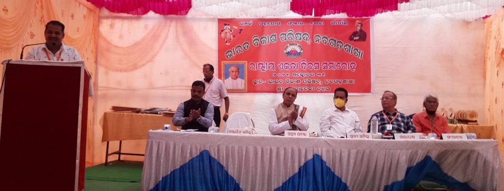 ନୟାଗଡ଼ ସର୍କିଟ ହାଉସ ନିକଟ ଭାରତ ବିକାଶ ପରିଷଦ କାର୍ଯ୍ଯାଳୟ ତଥା ପରିଷଦର ଶ୍ରୀକମଳାଦେବୀନ୍ଯାସ ପରିସରରେ ଶାଖା ତରଫରୁ ରାଷ୍ଟ୍ରୀୟ ଏକତା ଦିବସ ଶାଖା ଅଧ୍ଯକ୍ଷ ପ୍ରାଧ୍ୟାପକ ହରେକୃଷ୍ଣ ସାହୁଙ୍କ ଅଧ୍ଯକ୍ଷତାରେ ଅନୁଷ୍ଠିତ ହୋଇ ଯାଇଛି।ସର୍ବପ୍ରଥମେ ଜଗତର ନାଥ ଶ୍ରୀଜଗନ୍ନାଥ, ଭାରତ ମାତା,ସ୍ବାମୀ ବିବେକାନନ୍ଦ ଓ ସର୍ଦ୍ଦାର ବଲ୍ଲଭ ଭାଇ ପଟେଲଙ୍କ ପ୍ରତିଛବିରେ ପୁଷ୍ପ ଧୂପ ଓ ଦୀପ ଅର୍ପଣ କରାଯାଇ କୋଭିଡ୍ ନିୟମ ଅନୁପାଳନ ପୂର୍ବକ ସଭାକାର୍ଯ୍ୟ ପ୍ରାରମ୍ଭ ହୋଇଥିଲା।ଶାଖା ସଦସ୍ଯା ସୌଦାମିନୀ ସ୍ବାଇଁ ଅତିଥି ମାନଙ୍କ ର ପରିଚୟ ପ୍ରଦାନ କରିଥିଲା ବେଳେ ଶାଖା ସଚିବ ଅନାଦି ଚରଣ ମହାନ୍ତି ଶାଖାର ବାର୍ଷିକ ବିବରଣୀ ପଠନ କରିଥିଲେ। ମୁଖ୍ଯ ଅତିଥି ଭାବେ ନୟାଗଡ଼ ସ୍ବୟଂ ଶାସିତ ମହାବିଦ୍ୟାଳୟର ଅଧ୍ଯକ୍ଷ ସୁରେଶ କୁମାର ପ୍ରଧାନ,ମୁଖ୍ଯବକ୍ତା ଭାବେ ବିଶିଷ୍ଟ ବୈଦିକ ପ୍ରବକ୍ତା ବିରେନ୍ଦ୍ର କୁମାର ପଣ୍ଡା ଓ ସମ୍ମାନିତ ଅତିଥି ଭାବେ କ୍ଷେତ୍ରୀୟ ସଚିବ ଶ୍ରୀଧର ସାହୁ ମଞ୍ଚାସୀନ ହୋଇ ପରିଷଦର ଲକ୍ଷ୍ଯ ଆଭିମୁଖ୍ୟ ବିଷୟରେ ଆଲୋଚନା କରିବା ସହିତ ରାଷ୍ଟ୍ରୀୟ ଏକତା ଦିବସ ବିଷୟରେ ଅତିଥି ମାନେ ବକ୍ତବ୍ଯ ରଖିଥିଲେ।ଏହି ଉତ୍ସବ ପାଳନ ଅବସରରେ ୧୭ ଜଣ ନୂତନ ସଦସ୍ଯ ଭାବେ ସଦସ୍ୟତା ଗ୍ରହଣ କରିଥିବାରୁ ମୁଖ୍ଯ ବକ୍ତା ମହୋଦୟ ସେମାନଙ୍କୁ ଶପଥ ପାଠ କରାଇଥିଲେ।ଶାଖା ଦ୍ବାରା କରାଯାଇଥିବା ବିଭିନ୍ନ ସେବା ମୂଳକ କାର୍ଯ୍ୟକ୍ରମ ଯଥା ବୃକ୍ଷ ରୋପଣ, ରକ୍ତଦାନ ଶିବିର, ଫନି ସହାୟତା, ଘରପୋଡି ସହାୟତା, କମ୍ବଳ ବଣ୍ଟନ, ସରକାରଙ୍କ ଟୀକାକରଣ କାର୍ଯ୍ୟକ୍ରମରେ ସହାୟତା,ପୋଷ୍ଯଗ୍ରାମରେ ଅନୁଷ୍ଠିତ ହୋଇଥିବା ବିଭିନ୍ନ ଉନ୍ନୟନ ମୂଳକ କାର୍ଯ୍ୟକ୍ରମ ବିଷୟରେ ସଚିବ ବିବରଣୀ ପାଠ କରିଥିବା ବେଳେ ଉତ୍କର୍ଷ ସମ୍ମାନ,ଗୁରୁବନ୍ଦନ,ଏକଲାଗୀତ,ଭାରତକୁଜାଣ,ରାମାୟଣ ପ୍ରଶ୍ନତ୍ତୋରୀ ଆଦି ଅନେକ କାର୍ଯ୍ୟକ୍ରମର ପୁରସ୍କାର ବିତରଣ କରାଯାଇଥିଲା।ପରିଶେଷରେ ଶାଖାର ସେବା ସଚିବ ଦୁର୍ଯ୍ୟୋଧନ ସାହୁ ଧନ୍ଯବାଦ ଅର୍ପଣ କରିଥିଲାବେଳେ ଏହି କାର୍ଯ୍ୟକ୍ରମରେ ଶାଖା ଅର୍ଥ ସଚିବ ପ୍ରଫୁଲ କୁମାର ନାୟକ, ସମାଜସେବୀ ଅରୁଣ କୁମାର ମହାନ୍ତି,ପ୍ରାକ୍ତନ ସଚିବ ପ୍ରଦୀପ କୁମାର ସାହୁ ସହଯୋଗ କରିଥିେଲ।