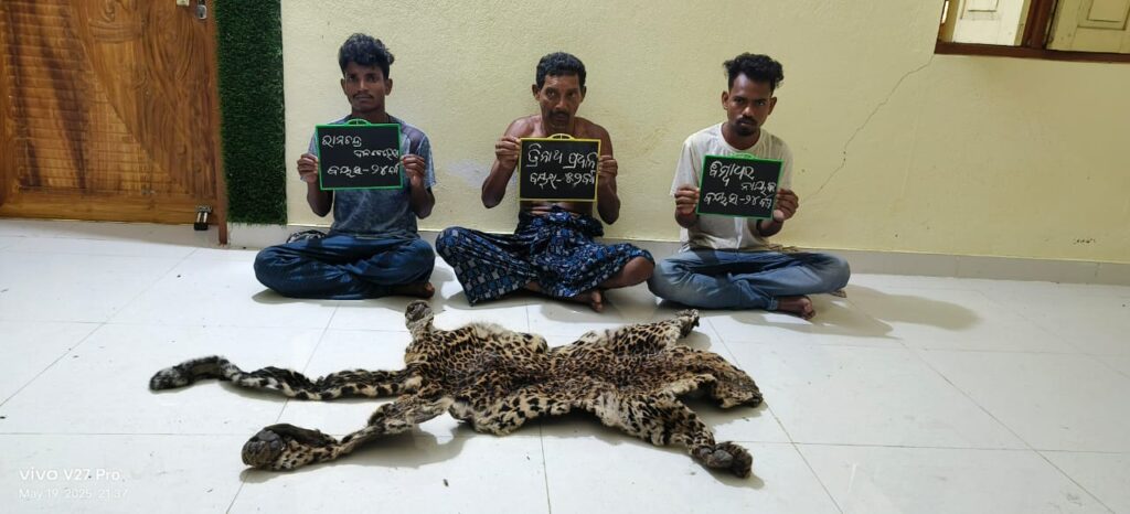 ବାଘ ଛାଲ ଜବତ,୩ ଶିକାରୀ ଗିରଫ , ଶିକାରରେ ବ୍ୟବହୃତ ବନ୍ଧୁକ ଜବତ।