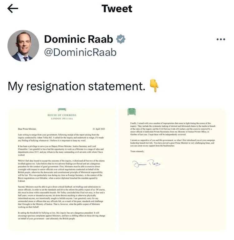 ଲଣ୍ଡନ,୨୧।୪: ବ୍ରିଟେନର ଉପ ପ୍ରଧାନମନ୍ତ୍ରୀ ଡୋମିନିକ ରାବ ଶୁକ୍ରବାର ଦିନ ତାଙ୍କ ପଦରୁ ଇସ୍ତଫା ଦେଇଛନ୍ତି। ସେ ସମସ୍ତଙ୍କୁ ଖରାପ ବ୍ୟବହାର କରୁଥିବା ଅଭିଯୋଗରେ ତାଙ୍କ ଉପରେ ତଦନ୍ତ ଚାଲିଛି। ଏହିି ପରିସ୍ଥିତିରେ ଡୋମିନିକ ଏକ ଚିଠି ଲେଖି ପ୍ରଧାନମନ୍ତ୍ରୀ ଋଷି ସୁନକଙ୍କୁ ତାଙ୍କ ଇସ୍ତଫା ପତ୍ର ଦେଇଛନ୍ତି।