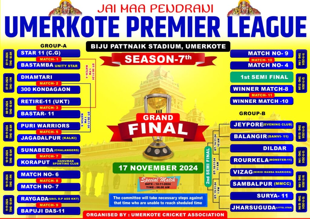 ଆରମ୍ଭ ହୋଇ ଯାଇଛି ଉମରକୋଟ ପ୍ରିମିଅର ଲିଗ UPL ର ୭ମ ସଂସ୍କରଣ। ଏହି ଉଦ୍ଘାଟନୀ ଉତ୍ସବ ରେ ନବରଙ୍ଗପୁର ର ପୂର୍ବତନ ସାଂସଦ ରମେଶ ଚନ୍ଦ୍ର ମାଝୀ, ସାଂସଦ ପ୍ରତିନିଧି ରାମ ନାୟକ, ରାଇଘର ବ୍ଲକ ଅଧକ୍ଷ ଗୁପ୍ତ ପ୍ରସାଦ ଝାଙ୍କର, ଉମରକୋଟ ମୁନିସିପାଲିଟି ଅଧକ୍ଷା ରାଧା ଭତ୍ରା, ବିଧାୟକ ପ୍ରତିନିଧି ଅଶୋକ ପାଢ଼ୀ, UPL ର ସଭାପତି ସୁଧାଂଶୁ ଦାସ, ଉପ ସଭାପତି ଚନ୍ଦନ ବେହେରା, ସମ୍ପାଦକ ଅଭିଳାଷ ପଟ୍ଟନାୟକ, କୋଷାଧକ୍ଷ ତପନ ପାତ୍ର, ମିଡ଼ିଆ ସଂଯୋଜକ ପ୍ରମୋଦ କୁମାର ରଥ, ପ୍ରୀତି ରଞ୍ଜନ ଦାସ ପ୍ରମୁଖ ଉପସ୍ଥିତ ଥିଲେ। ଆଜିର ଉଦ୍ଘାଟନୀ ମ୍ୟାଚ ଷ୍ଟାର ୧୧ (ଛତିଶଗଡ) ଓ ବସ୍ତାମ୍ବା ୟୁନିଟ ଷ୍ଟାର ମଧ୍ୟରେ ହୋଇଥିଲା। ଟସ ଜିତି ବସ୍ତାମ୍ବା ୟୁନିଟ ଷ୍ଟାର ପ୍ରଥମେ ବ୍ୟାଟିଂ କରି ୧୫ ଓଭର ରେ ୫ ୱ୍ୱିକେଟ ହରାଇ ୧୩୬ ରନରେ CG 11 ଠାରୁ ପରାଜୟ ହୋଇଥିବା ବେଳେ ଦ୍ୱିତୀୟ ମ୍ୟାଚ ଧମତ୍ତ୍ୱରୀ ୧୧ କୋଣ୍ଡାଗାଁ ମଧ୍ୟରେ ୧୫ ଓଭରରେ ୧୫୩ ହାସଲ କରି ୪୪ ରନରେ ବିଜୟ ହାସଲ କରିଛନ୍ତି। ଏହି ପରି ୨୦ ଗୋଟି ଟିମ ଭାଗ ନେଇଥିବା ସୂଚନା ମିଳିଛି। ଏହି ମ୍ୟାଚ ରେ ପ୍ରଥମ ବିଜୟୀ ଙ୍କୁ ୧, ୧୧, ୧୧୧/- , ରନର ଉପ ଙ୍କୁ ୮୮, ୮୮୮/- ଓ ମ୍ୟାନ ଅଫ the ସିରିଜ କୁ ୧୫, ୧୫୧/- ର ଅର୍ଥ ରାଶିର ପୁରସ୍କାର ରଖାଯାଇଛି।