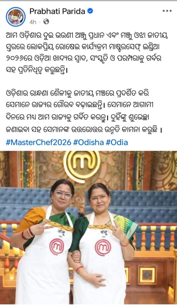 ସୋନି ଟିଭିର ଲୋକପ୍ରିୟ ରିୟଲିଟି ସୋ ମାଷ୍ଟର ସେଫ୍ ଇଣ୍ଡିଆରେ ଦେଖିବାକୁ ମିଳିବ ପୁରୀର ତଥା ଶ୍ରୀମନ୍ଦିର ସେବାୟତ ଘରର ବୋହୂ ଅଞ୍ଜୁ ପ୍ରଧାନଙ୍କ ଡିସ୍ ର ଜଲଓ୍ବା। ଭଉଣୀ ମଞ୍ଜୁ ଓଝାଙ୍କ ସହ ସେ ମାଷ୍ଟର ସେଫ୍ ଇଣ୍ଡିଆର ଫାଇନାଲ ରାଉଣ୍ଡରେ ପହଞ୍ଚିଛନ୍ତି। ତେବେ ଚୟନ ହୋଇଥିବା ଶହେ ଜଣ ପ୍ରତିଯୋଗୀଙ୍କ ମଧ୍ୟରେ ଚାରୋଟି ପର୍ଯ୍ୟାୟରେ ଏହି ଦୁଇ ଯୋଡ଼ି ଫାଇନାଲ ରାଉଣ୍ଡରେ ପହଞ୍ଚିଛନ୍ତି। TOP 10 ରେ ସ୍ଥାନ ପାଇଛନ୍ତି ଅଞ୍ଜୁ ମଞ୍ଜୁ ଯୋଡ଼ି। ଦୁଇ ଭଉଣୀ ଅଞ୍ଜୁ ଓ ମଞ୍ଜୁଙ୍କ ଯୋଡ଼ି ଦ୍ବାରା ପ୍ରସ୍ତୁତ ଖାଦ୍ୟକୁ ବିଚାରକ ମାନେ ଖୁବ୍ ପ୍ରଶଂସା କରିଛନ୍ତି। ତେବେ ଓଡ଼ିଶାବାସୀ ତାଙ୍କ ଇନଷ୍ଟାଗ୍ରାମ ମାଧ୍ୟମରେ ଭୋଟିଂ କରି ଫାଇନାଲ ରାଉଣ୍ଡରେ ଜିତାଇବାକୁ ଦୁଇ ଭଉଣୀ ଅଞ୍ଜୁ ଓ ମଞ୍ଜୁ ନିବେଦନ କରିଛନ୍ତି। ବାଇଟ1- ଅଞ୍ଜୁ ପ୍ରଧାନ, ସେବାୟତ ଘରର ବୋହୂ,,,ଭିଓ- ସେପଟେ କେନ୍ଦ୍ର ଶିକ୍ଷାମନ୍ତ୍ରୀ ଧର୍ମେନ୍ଦ୍ର ପ୍ରଧାନ,,,ଆଇନମନ୍ତ୍ରୀ ପୃଥ୍ୱୀରାଜ ହରିଚନ୍ଦନ ଏବଂ ଉପମୁଖ୍ୟମନ୍ତ୍ରୀ ପ୍ରଭାତୀ ପରିଡା ମଧ୍ୟ ଦୁଇ ଉଣୀଙ୍କ ସଫଳତା କାମନା କରିବା ସହ ଓଡିଶାକୁ ଗୌରବାନ୍ୟୁତ କରନ୍ତୁ ବୋଲି ସୋସିଆଲ ମିଡିଆରେ ଶୁଭେଚ୍ଛା ଜଣାଇଛନ୍ତି। ପୁରୀ ବାସିନ୍ଦା ତଥା ଶ୍ରୀମନ୍ଦିର ସେବାୟତ ପରିବାରର ବୋହୂ ଅଞ୍ଜୁ ପ୍ରଧାନ ପୁରୀର ପୂର୍ବତନ ନଗରପାଳ ଗୋରହରି ପ୍ରଧାନଙ୍କ ପତ୍ନୀ।