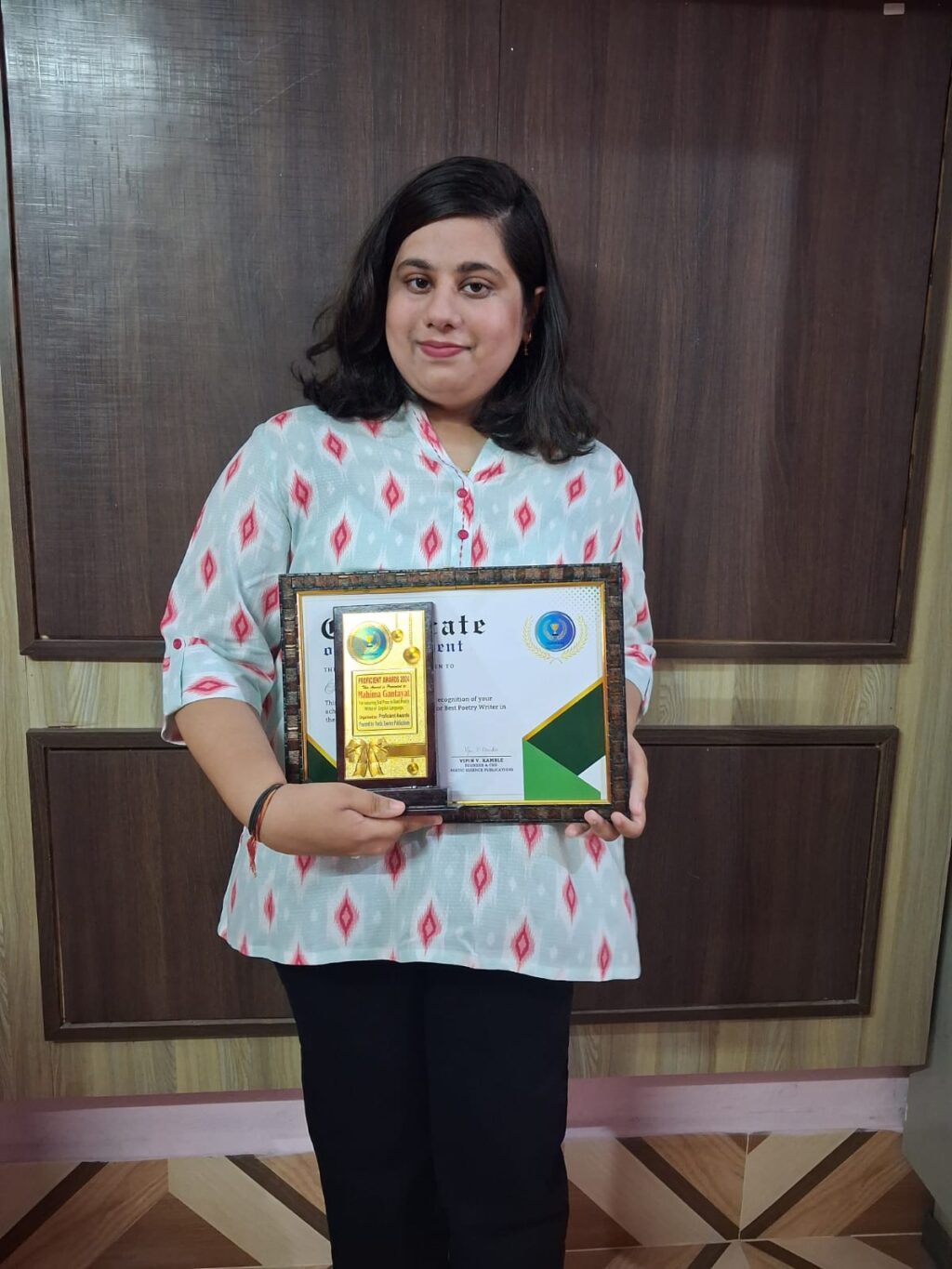 ରାୟଗଡ଼ା ତା ୦୩-୦୬-୨୫ ମୁମ୍ବାଇ ସ୍ଥିତ ଦେଶର ଅନ୍ୟତମ ପ୍ରସିଦ୍ଧ ପ୍ରକାଶନ ସଂସ୍ଥା ପୋଏଟିକ୍ ଏସେନ୍ସ ପ୍ରକାଶନ ଦ୍ୱାରା ଗତ ଜାନୁଆରୀ ୨୦୨୫ରେ ଆୟୋଜିତ ଜାତୀୟ ସ୍ତରୀୟ ପ୍ରତିଭା ପୁରସ୍କାର 2024 ପ୍ରତିଯୋଗିତାରେ ରାୟଗଡ଼ାର ଯୁବ ଲେଖିକା ମହିମା ଗନ୍ତାୟତ ଇଂରାଜୀ ବର୍ଗରେ ଶ୍ରେଷ୍ଠ କବି ଭାବରେ ତୃତୀୟ ସ୍ଥାନ ହାସଲ କରିଛନ୍ତି।